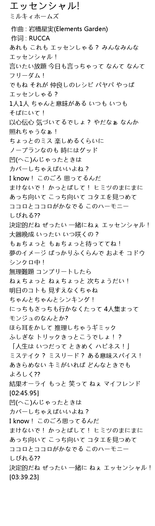 | [00:13.28] | あれも これも エッセンしゃる? みんなみんな エッセンシャル! |