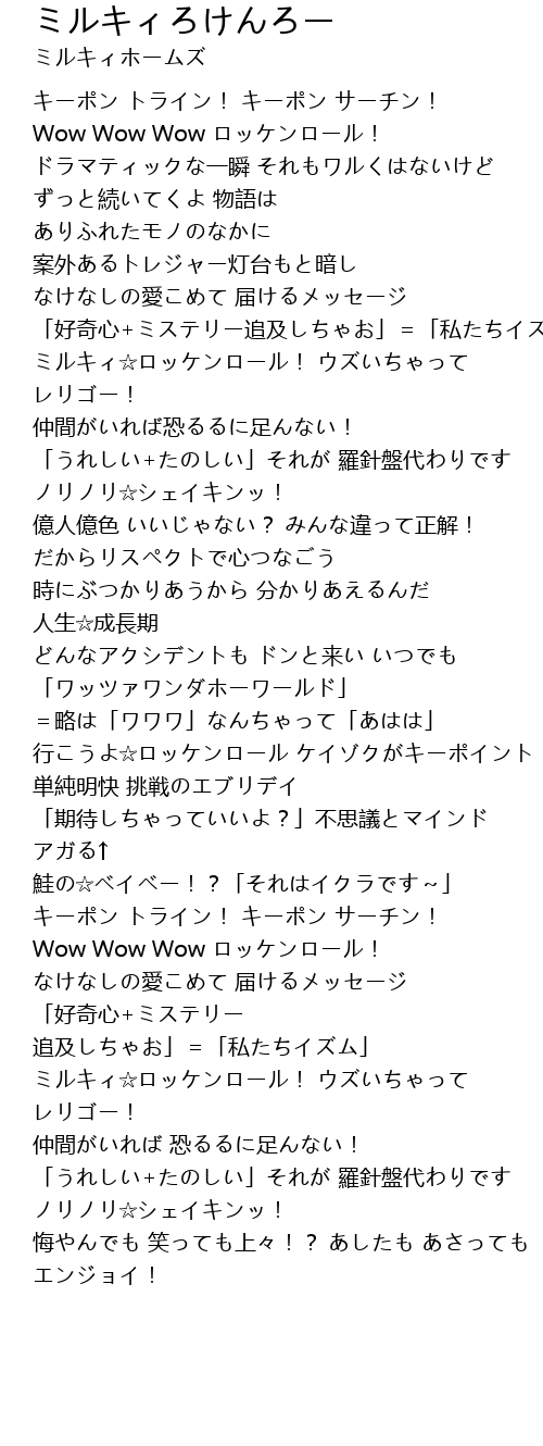 | [00:59.58] | ミルキィ☆ロッケンロール! ウズいちゃって レリゴー! |
