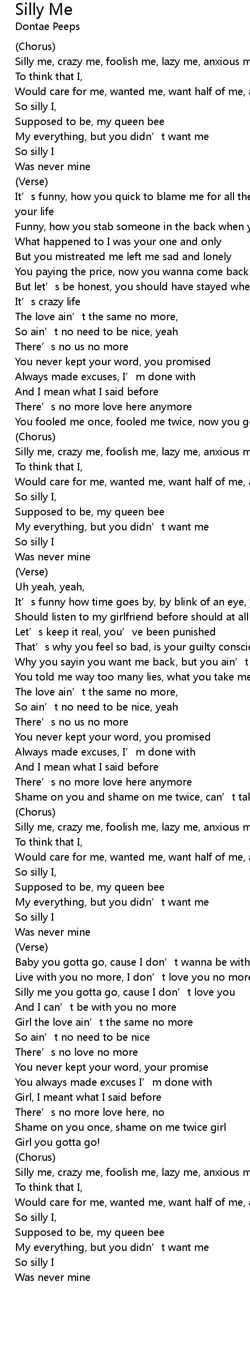 | Silly me, crazy me, foolish me, lazy me, anxious me | |