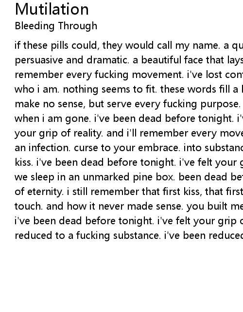 if these pills could, they would call my name. a quick end. suicide becomes so persuasive and dramatic. a beautiful face that lays quietly beside me. and i'll remember every fucking movement. i've lost control. and i'm losing control of who i am. nothing seems to fit. these words fill a helpless length of time. they make no sense, but serve every fucking purpose. into substance. remember my face when i am gone. i've been dead before tonight. i've felt your grip of eternity, your grip of reality. and i'll remember every movement, and i'll study it like an infection. curse to your embrace. into substance. crushed by your bloody kiss. i've been dead before tonight. i've felt your grip of eternity. together we sleep in an unmarked pine box. been dead before tonight. i've felt your grip of eternity. i still remember that first kiss, that first look, that first touch. and how it never made sense. you built me up just to be broken. i've, i've been dead before tonight. i've felt your grip of eternity. i've been reduced to a fucking substance. i've been reduced to a fucking substance. |
