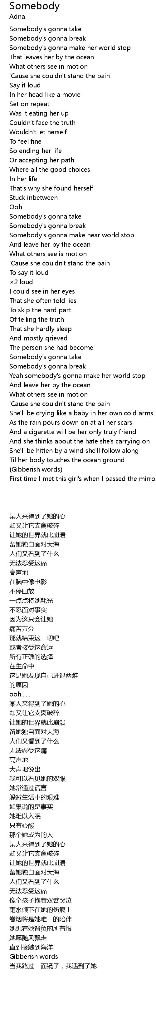 | [02:44.89] | Yeah somebody's gonna make her world stop |