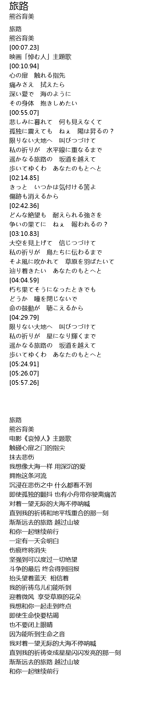 | [04:56.34] | 遥かなる旅路の 坂道を越えて |