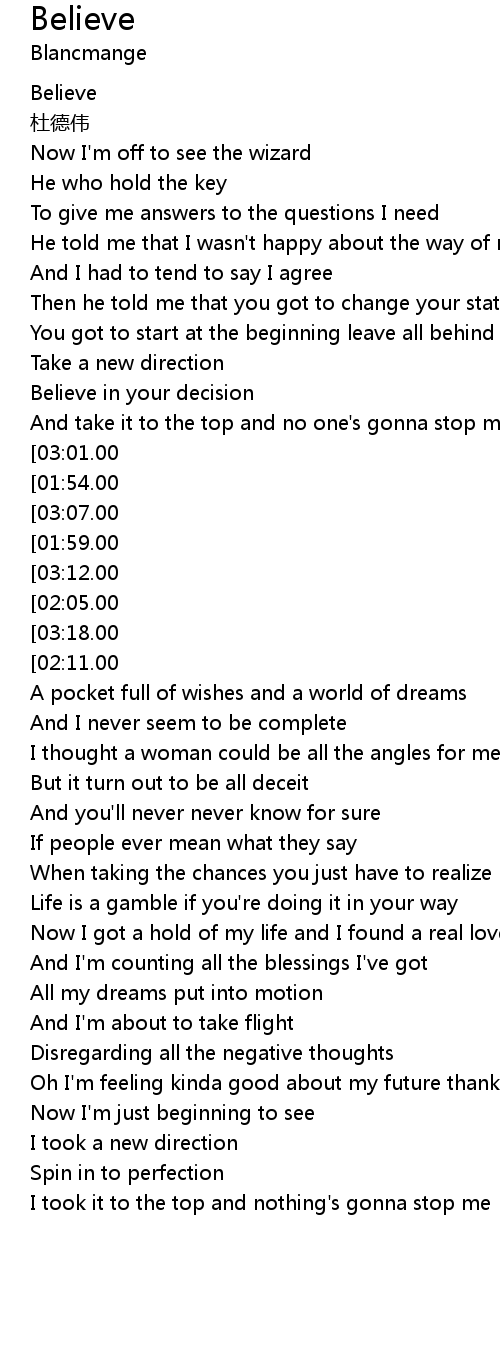 | [03:21.00][02:11.00][01:15.00] | Just as long as I believe in me |