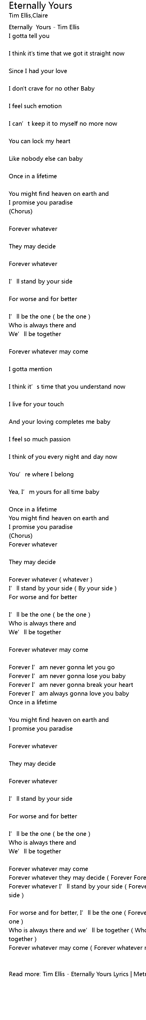 | Read more: Tim Ellis - Eternally Yours Lyrics | MetroLyrics |