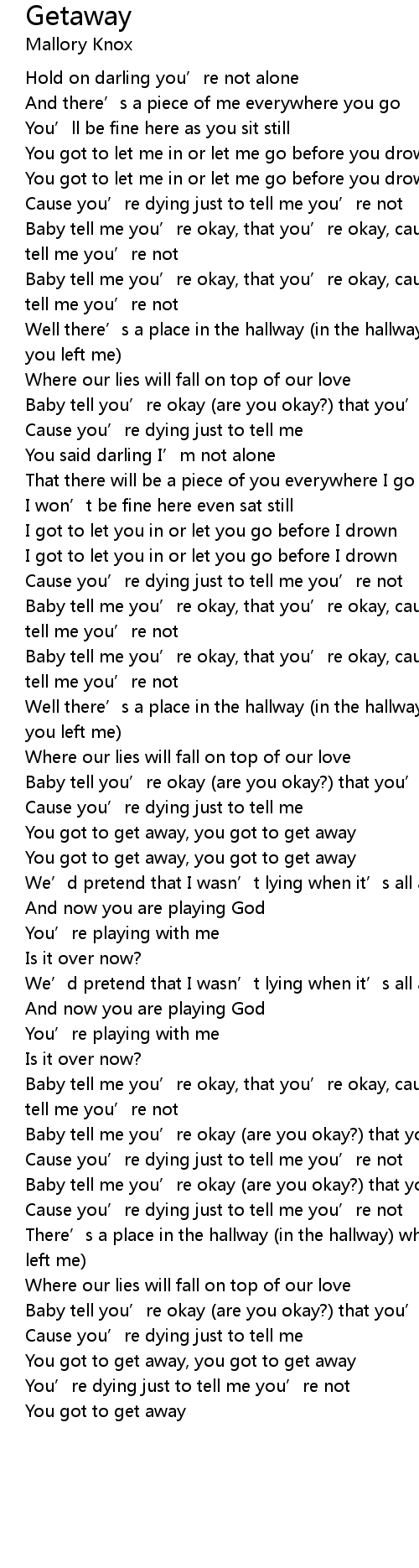 | Baby tell me you' re okay, that you' re okay, cause you' re dying just to tell me you' re not | |