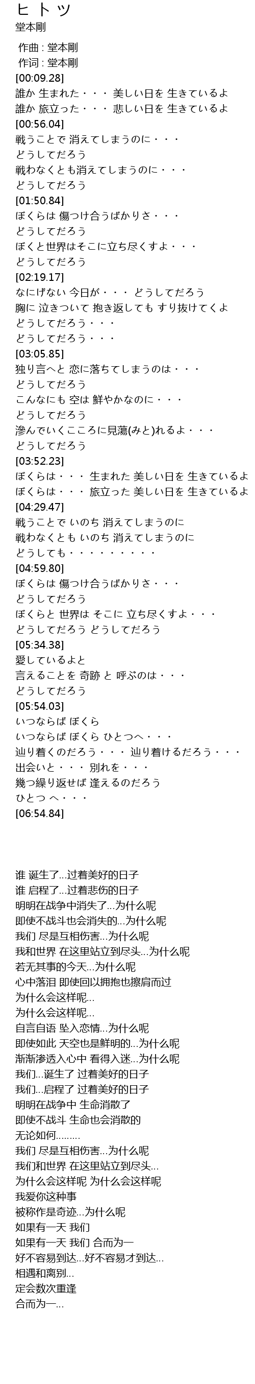 | [02:10.09] | ぼくと世界はそこに立ち尽くすよ・・・ どうしてだろう |