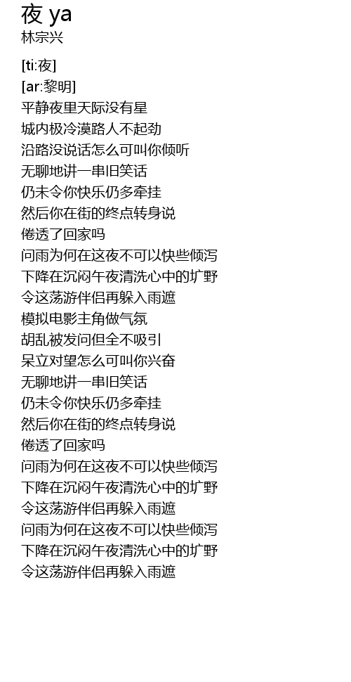 | [03:17.154] | 问雨为何在这夜不可以快些倾泻 |