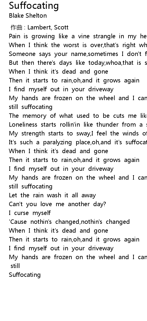 | [01:12.44] | My hands are frozen on the wheel and I can feel your love still suffocating |