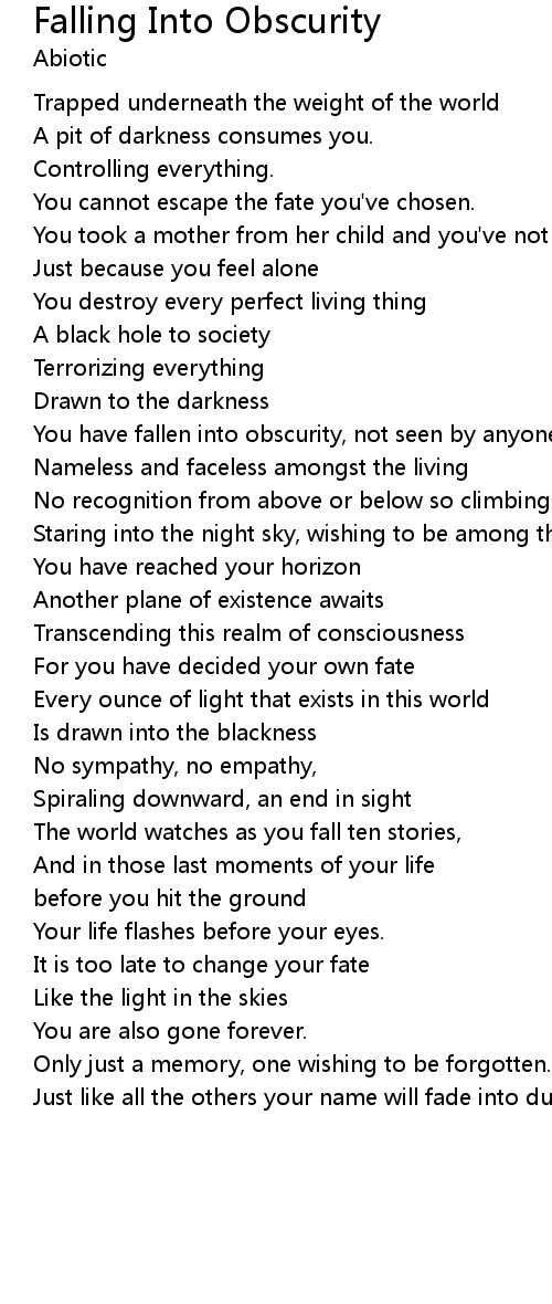 | You have fallen into obscurity, not seen by anyone or anything | |