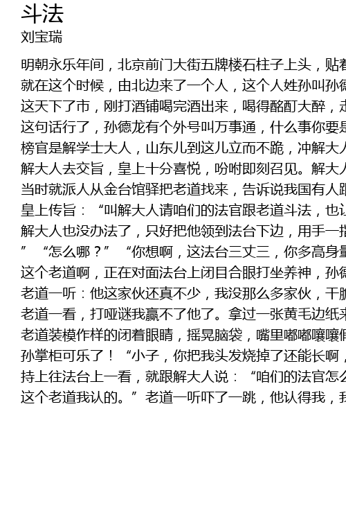 | chí shàng wǎng fǎ tái shàng yī kàn, jiù gēn jiě dà rén shuō:" zán men de fǎ guān zěn me hái bù xià tái ya?" tā yě de xià de lái ya! sūn zhǎng guì zài tái shàng nà néng ér zhuàn mò:" āi! zhè shì zěn me huí shì, dǎo shì shū le yíng le"? tā hái bù zhī dào nǎ. huáng shàng yī qiáo, shuō:" xiǎng bì wǒ jiā fǎ guān bèi mó huǒ shāo shāng, gǎn kuài pài rén bǎ fǎ guān jiē xià fǎ tái." huáng shàng zhè jù huà dé xíng dà le. gāng cái rēng shǎng qù de, zhè yào shì wǎng xià tiào fēi shuāi sǐ bù kě. huáng shàng yī shuō bǎ tā jiē xià lái, yǒu rén lì hǎo le yún tī, sūn zhǎng guì shùn tī zi jiù xià lái le. jiě dà rén guò lái shuō:" zǒu, gēn wǒ jiàn huáng shǎng qù, yào duō kē tóu shǎo shuō huà." zěn me? pà tā jiàn huáng shàng zài lái gè" zán gē liǎ lǎo méi jiàn le". sūn dé lóng dào le tài hé diàn tóu lǐ, chōng huáng shàng zuò le gè dà yī:" hē!" huáng shàng yī qiáo, nǐ yào yǎo wǒ shì zěn me zhāo?" zán gěi lǎo huáng shàng kē tóu le." tā zhè yī yíng, huáng shàng gāo xìng:" fǎ guān tái qǐ tóu lái." bié rén dōu dé shuō" yǒu zuì bù gǎn tái tóu"," shù nǐ wú zuì", zhè cái tái tóu." sūn zhǎng guì mǎn bù dǒng, yī tái tóu zhí méi dèng yǎn qiáo zhe huáng shàng:" gàn shén me?" shàng rén jiàn xǐ, huáng shàng lè le:" fǎ guān nǐ dòu fǎ shì shū le shì yíng le?" sūn zhǎng guì jiù pà wèn zhè jù, shū yíng lián tā zì jǐ yě bù zhī dào, tā dī xià tou qù zhuāng tīng bu jiàn. tā zhè yī dī tóu, huáng shàng yòu wèn:" nǐ shū le nǐ yíng le?" tā wǎng páng biān yī kàn, zhèng qiáo jiàn lǎo dào. zhèng gǎn shàng zhè shí hòu huáng shàng wèn zhè dì sān jù:" fǎ guān! nǐ gēn lǎo dào dòu fǎ shì shū le shì yíng le?"" wǒ shuō huáng shàng, nǐ lǎo rén jiā wèn wǒ shū le yíng le, zhè gè huà wǒ bù hǎo shuō ya! zěn me ne? wǒ yào shì shuō wǒ yíng le, nà jiào lǎo wáng mài guā zì mài zì kuā kě wǒ yào shì shuō wǒ shū le ba, wǒ gàn shén me lái le? méi yǒu jīn gāng zuàn jiù bù gǎn lǎn cí qì." jiě dà rén yī tīng: nǐ nǎ ér nà me duō qiào pí huà ér a!" nǐ lǎo rén jiā wèn wǒ shū le wǒ yíng le, nǐ bié wèn wǒ." yī zhǐ lǎo dào," nǐ wèn tā! tā shuō wǒ shū le jiù suàn wǒ shū le, tā shuō wǒ yíng le jiù suàn wǒ yíng le. lǎo dào! nǐ yào shì shuō wǒ shū le zán liǎ shàng tái zài gàn." lǎo dào yī wǔ sāi bāng zǐ:" gàn bù liǎo! tā yíng le."" huáng shàng tīng jiàn le ba, wǒ yíng le! wǒ yíng le!" huáng shàng shuō:" fǎ guān nǐ jiào shén me míng zì?"" wǒ xìng sūn jiào sūn dé lóng, zhù jiā zài ròu shì, dé lóng guǎn nà gè xiǎo mǎi mài shì wǒ kāi de, zán shì zhǔn jīn shí liù liǎng jué bù shǎo gěi fèn liàng." shuí wèn zhè gè le!" nǐ men liǎ yī jiàn miàn, tā shuō' wú liàng fú' shì zěn me huí shì?"" zhè' wú liàng fú' shì zěn me jù huà, huáng shàng! | |