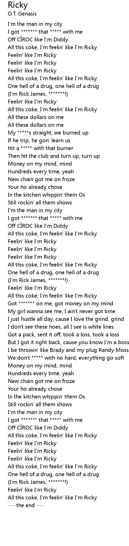 | [03:33.23] | All this coke, I'm feelin' like I'm Ricky |