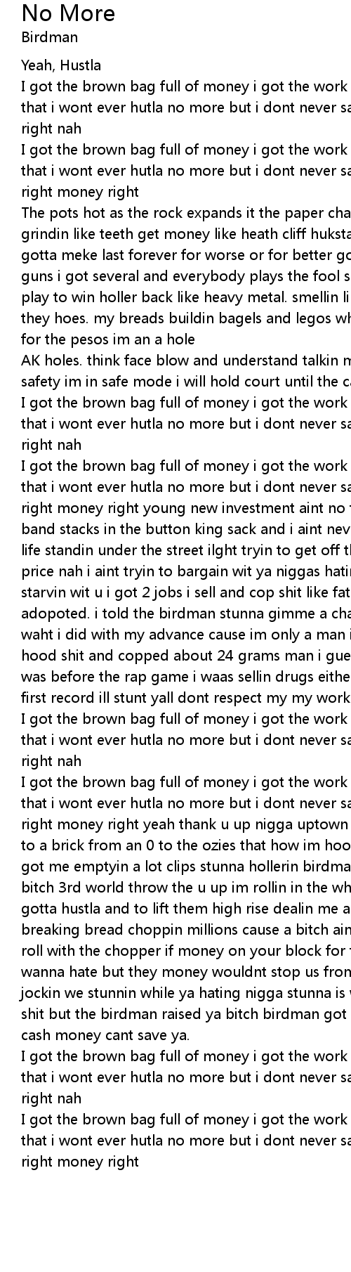 I got the brown bag full of money i got the work goin to florida and i swore that i wont ever hutla no more but i dont never say that no more got my mind right money right yeah thank u up nigga uptown from an 8 to a quater from a half to a brick from an 0 to the ozies that how im hood rich and murder was the case got me emptyin a lot clips stunna hollerin birdman nigga right back in this bitch 3rd world throw the u up im rollin in the whip with this money on my mind gotta hustla and to lift them high rise dealin me and youngin on some shit breaking bread choppin millions cause a bitch aint shit told as a youngin how roll with the chopper if money on your block for the money ima pop ya nigga wanna hate but they money wouldnt stop us from ridin fly whips now they hoe out jockin we stunnin while ya hating nigga stunna is wat made ya i hear ya poppin shit but the birdman raised ya bitch birdman got an army birdman got a navy and cash money cant save ya.