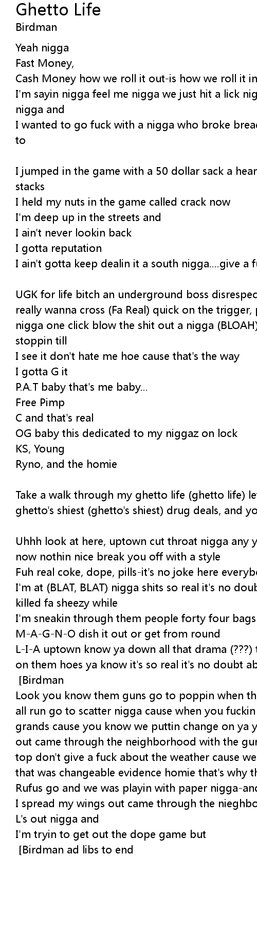 Take a walk through my ghetto life (ghetto life) let me show you that my ghetto's shiest (ghetto's shiest) drug deals, and young niggaz gettin'killed