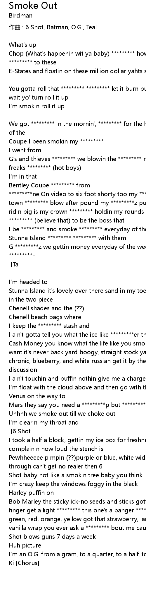 | Cash Money you know what the life like you smoke what you can, we smoke what we want it' s never back yard boogy, straight stock yard funk the higher ponic chronic, blueberry, and white russian get it by the block it ain' t open for discussion | |