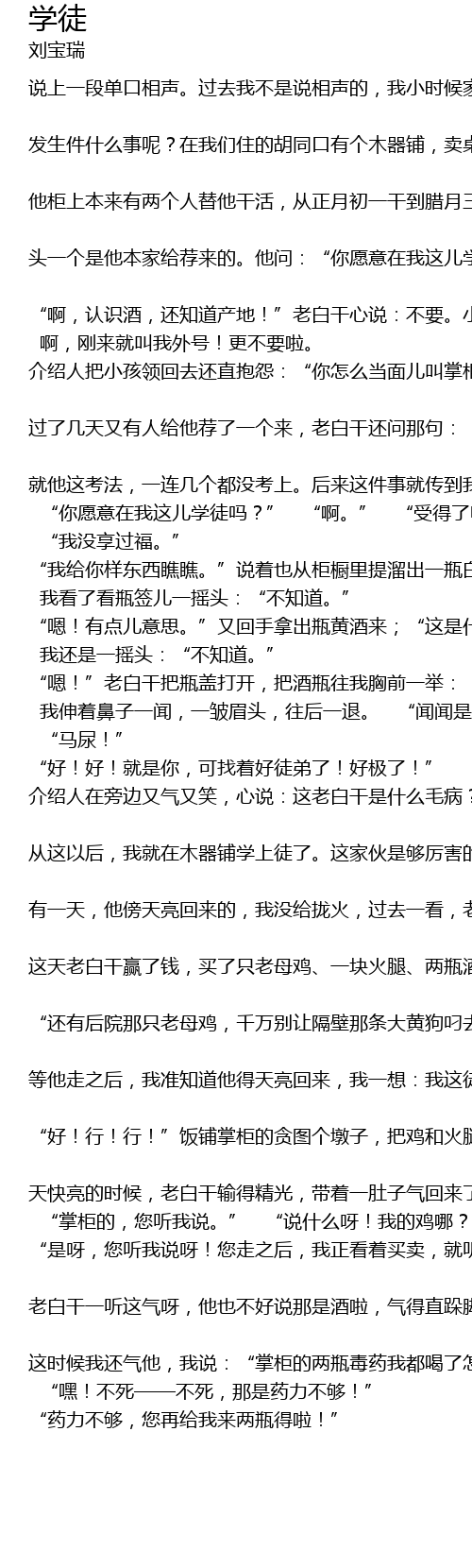 | 说上一段单口相声。过去我不是说相声的,我小时候家里没辙,念了几天书,就给我找了个学徒的地方。头一回是古玩铺,论起来古玩铺有真学头,里边学问不少,我学了一年多,别的没学会,就学会了抱孩子。家里看我整天给师娘抱孩子,什么也学不到,就托人送我去学厨子,就是现在说的炊事员,又是一年多,我就学会了剥葱剥蒜!后来,我觉着说相声不错,正巧我的老师就住在我们一条胡同,我就跟家里说:“我去说相声。”可是老师不收,后来怎么又收了呢?因为有这么一件事情,老师看着我够说相声的材料,又非收我这个徒弟不可。 发生件什么事呢?在我们住的胡同口有个木器铺,卖桌椅板凳,掌柜的有个外号叫“老白干”,一来说他好喝酒,喝得还挺凶。起来就喝,喝了就醉,醉了就睡,睡醒了去耍,输了回来心里懊糟,得喝;赢了钱心里痛快,更得喝。二来是说这个掌柜的待人比白干还辣,二锅头才六十五度,他这老白干足够一百零八度,对人甭提多苛刻啦。 他柜上本来有两个人替他干活,从正月初一干到腊月三十也挣不了几个钱,每天还吃不饱。就这样,老白干还觉着不上算,想来想去,想找个徒弟,就把工人散了。老白干为什么散工人,找徒弟呢?因为用徒弟只管吃穿,不给工钱,吃的是剩粥烂菜,穿的是他的破烂衣裳,一个徒弟按规矩要学三年零一节,其实有一年来的,徒弟就能干活,剩下的两年全是给他白干,而且徒弟还能伺候他。他找徒弟的贼心还挺大,老怕徒弟偷他,桌椅板凳,当然是谁也嚼不动啃不动,他最怕偷他酒喝。所以他找徒弟除了条件挺苛刻以外,还要当面考问。老白干考徒弟的方法很简单,可是挺特别,来了好几个都没考上。 头一个是他本家给荐来的。他问:“你愿意在我这儿学徒吗?”“是,愿意。”“我给你看样东西。”老白干说着就回身从柜橱里提溜瓶儿白酒出来,冲小孩一举:“你看这是什么?”小孩一看瓶签写着山西汾酒,就说:“是山西汾酒。” “啊,认识酒,还知道产地!”老白干心说:不要。小孩又说了句:“这是著名的老白干。” 啊,刚来就叫我外号!更不要啦。 介绍人把小孩领回去还直抱怨:“你怎么当面儿叫掌柜的外号?他还能收你!”您说这小孩够多冤! 过了几天又有人给他荐了一个来,老白干还问那句:“你愿意在我这学徒呀?”“愿意。”“我给你看样东西。”老白干这回从柜橱里拎瓶黄酒出来:“你看这是什么?”“是陈绍,又叫花雕。”“啊!酒的小名你知道,大名你也知道。不要!不要!”介绍人心说:这掌柜的又喝多了吧!怎么答对了倒不要? 就他这考法,一连几个都没考上。后来这件事就传到我耳朵里了。我就跟家里人说:“我上木器铺学徒。”家里说:“那可不行,老白干对工人那么辣,上他那儿学徒,谁也受不了。”我说:“我能受得了。”“他可不管饱吃!”我说:“那没关系。”“他得考。”我说:“我去了,一考就中。”家里见我非去不可,就托人把我荐去了。我跟介绍人到了木器铺之后,对我也还是那一套。 “你愿意在我这儿学徒吗?” “啊。” “受得了吗?” “我没享过福。” “我给你样东西瞧瞧。”说着也从柜橱里提溜出一瓶白干酒:“这是什么?” 我看了看瓶签儿一摇头:“不知道。” “嗯!有点儿意思。”又回手拿出瓶黄酒来;“这是什么?” 我还是一摇头:“不知道。” “嗯!”老白干把瓶盖打开,把酒瓶往我胸前一举:“你问闻是什么?” 我伸着鼻子一闻,一皱眉头,往后一退。 “闻闻是什么? “马尿!” “好!好!就是你,可找着好徒弟了!好极了!” 介绍人在旁边又气又笑,心说:这老白干是什么毛病?把酒当马尿,骂了你,你倒要了,真是什么人都有。 从这以后,我就在木器铺学上徒了。这家伙是够厉害的,我起五更,睡半夜,还没吃过饱饭。老白干又好打牌,每天不过十二点不回来,我得给等门。他半夜回来,我就得给他拢火沏茶,他还说费煤:“你来这么几天,烧多少煤球儿啦!得省着点儿。”我说:“唉。” 有一天,他傍天亮回来的,我没给拢火,过去一看,老白干躺在床上睡得挺香,嘴里还红中、白板的说着梦话,我走过去:“掌柜的!掌柜的!您醒醒!”老白干一翻身揉了揉眼睛:“什么事呀?”我说:“掌柜的您不是让我省着点烧煤吗!刚才我拢火数了数一共烧了四十八个煤球。”“嗐!这事你告诉我干吗,成心捣乱。去!去!”从这儿起他再也不说费煤了。 这天老白干赢了钱,买了只老母鸡、一块火腿、两瓶酒回来,打算大吃大喝一顿。等他刚睡醒觉,牌友儿就来找他去打牌,他赢了钱,正惦记着要,就跟牌友儿去了。临走的时候对我说:“我打牌去了,明儿早晨回来。在柜上好好看门儿。看见了吗?这是块火腿,你把它挂在墙上,留神别让猫偷去。”“唉!” “还有后院那只老母鸡,千万别让隔壁那条大黄狗叼去!”“唉!”说着又一指柜门:“我柜里有两瓶东西,要特别注意,那是——两瓶——毒药。一瓶红砒霜;一瓶绿砒霜。吃了就死,千万别动!”“唉。”“记住了吗?”记住了。”说完他就走了。 等他走之后,我准知道他得天亮回来,我一想:我这徒弟也就学到这儿啦,没法再往下学啦。我到后院把老母鸡逮着,托着火腿奔了胡同里一个饭铺,我常到这个饭铺给老白干叫饭,跟他们都熟,进门我说:“掌柜的,我们掌柜的说啦,最近来了批木料,用完了,给你们留个墩子。我们掌柜的说,有只老母鸡,让您给收拾收拾,还有块火腿,请您给剁一剁。” “好!行!行!”饭铺掌柜的贪图个