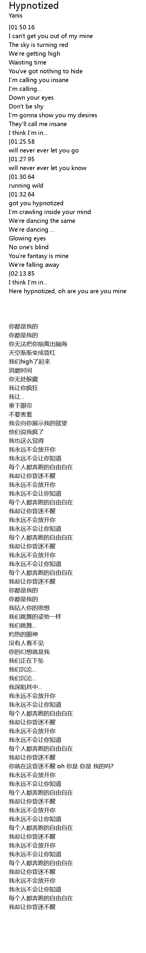 | [01:42.65][01:32.64][01:22.49][01:12.49][03:59.08][03:49.01][03:38.84][03:28.64][02:38.15][02:28.27] | I got you hypnotized |