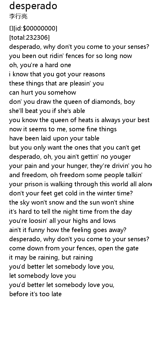 | [02:46.380] | desperado, why don' t you come to your senses? |