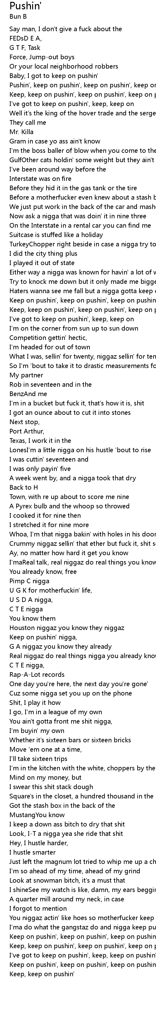 | I'ma do what the gangstaz do and nigga keep pushin' | |