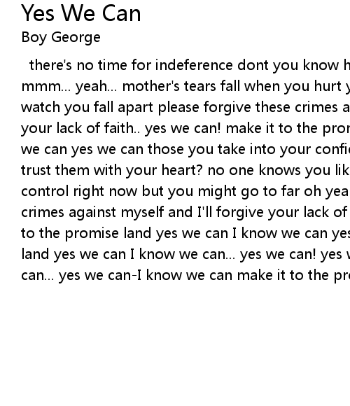 there's no time for indeference dont you know how truly blessed you are? mmm... yeah... mother's tears fall when you hurt yourself while others wait to watch you fall apart please forgive these crimes against myself and I'll forgive your lack of faith.. yes we can! make it to the promise land yes we can I know we can yes we can those you take into your confidence can you trust them... trust them with your heart? no one knows you like you know yourself you're in control right now but you might go to far oh yeah, I say please forgive these crimes against myself and I'll forgive your lack of faith.. yes we can! make it to the promise land yes we can I know we can yes we can make it to the promise land yes we can I know we can... yes we can! yes we can-yes we can- yes we can... yes we can-I know we can make it to the promise land... |