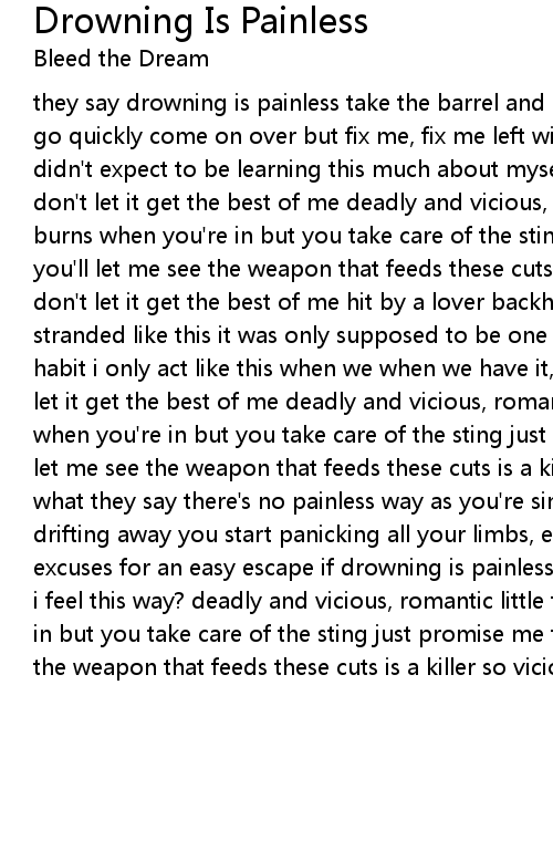 they say drowning is painless take the barrel and aim this gun at me i'd rather go quickly come on over but fix me, fix me left with the heaviest burden i didn't expect to be learning this much about myself this way vicious behavior don't let it get the best of me deadly and vicious, romantic little thing it burns when you're in but you take care of the sting just promise me this much- you'll let me see the weapon that feeds these cuts is a killer so vicious oh, don't let it get the best of me hit by a lover backhanded i didn't expect to be stranded like this it was only supposed to be one kiss one kiss turned into a habit i only act like this when we when we have it, yea vicious behavior don't let it get the best of me deadly and vicious, romantic little thing it burns when you're in but you take care of the sting just promise me this much- you'll let me see the weapon that feeds these cuts is a killer so vicious in me forget what they say there's no painless way as you're sinking, you're thinking about drifting away you start panicking all your limbs, everything freezing up making excuses for an easy escape if drowning is painless, drowning is painless why do i feel this way? deadly and vicious, romantic little thing it burns when you're in but you take care of the sting just promise me this much- you'll let me see the weapon that feeds these cuts is a killer so vicious |