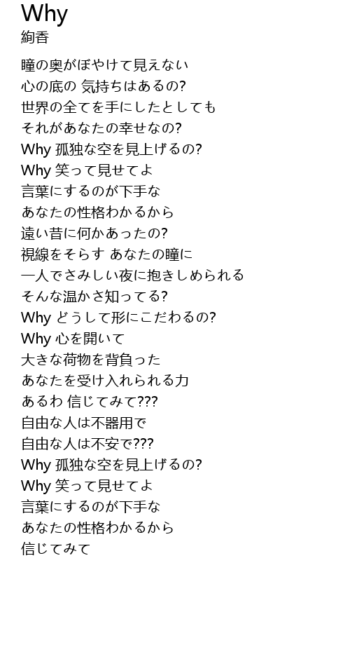 | [02:54.25] | Why 孤独な空を見上げるの? |