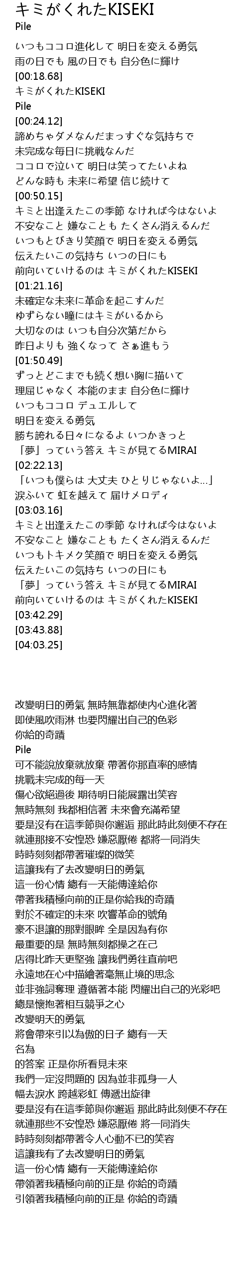 | [03:35.10] | 前向いていけるのは キミがくれたKISEKI |