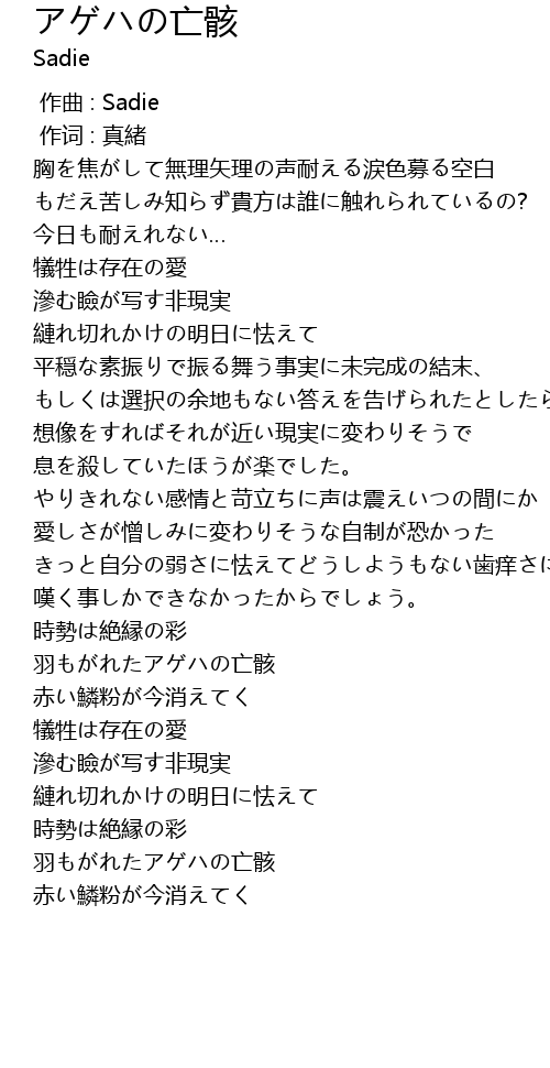 | [03:56.310] | 羽もがれたアゲハの亡骸 |