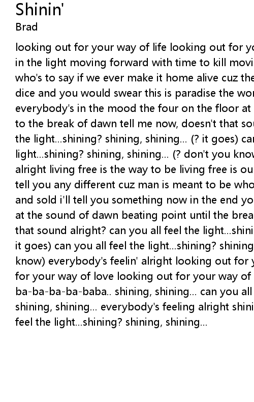 looking out for your way of life looking out for your way of love walking tall, in the light moving forward with time to kill moving forward was such a thrill who's to say if we ever make it home alive cuz the captain's here with all his dice and you would swear this is paradise the word on the street is that everybody's in the mood the four on the floor at the sound of dawn beating point to the break of dawn tell me now, doesn't that sound alright? can you all feel the light...shining? shining, shining... (? it goes) can you all feel the light...shining? shining, shining... (? don't you know) everybody's feelin' alright living free is the way to be living free is our destiny don't let anyone tell you any different cuz man is meant to be whole not kicked around, bought, and sold i'll tell you something now in the end you'll see the four on the floor at the sound of dawn beating point until the break of dawn tell me now, doesn't that sound alright? can you all feel the light...shining? shining, shining... (? it goes) can you all feel the light...shining? shining, shining... (? don't you know) everybody's feelin' alright looking out for your way of life looking out for your way of love looking out for your way of life ba-ba-ba-ba-baba.. ba-ba-ba-ba-baba.. shining, shining... can you all feel the light...shining? shining, shining... everybody's feeling alright shining, shining... can you all feel the light...shining? shining, shining... |