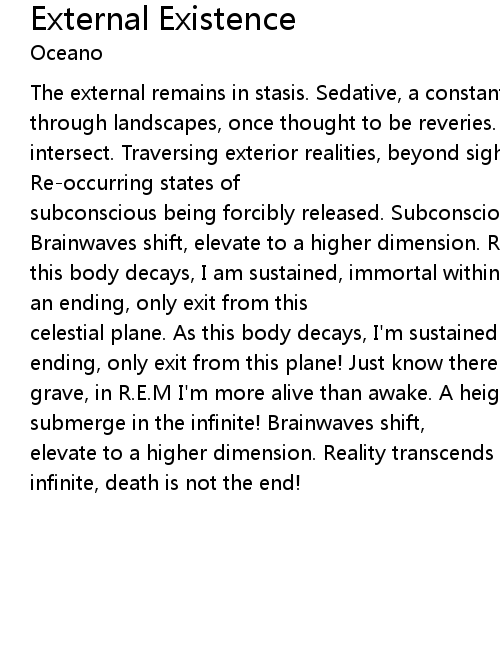 celestial plane. As this body decays, I'm sustained as an entity without an ending, only exit from this plane! Just know there is something beyond the grave, in R.E.M I'm more alive than awake. A heightened sense of existence, submerge in the infinite! Brainwaves shift,