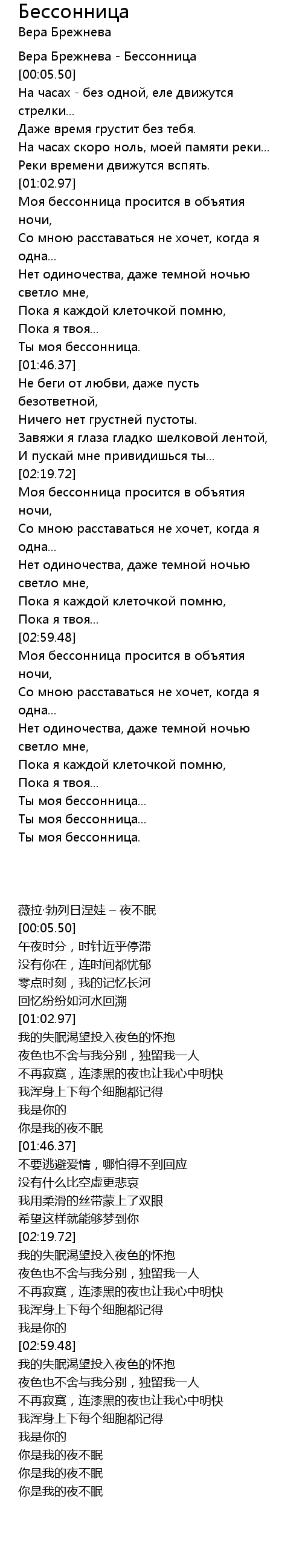 | [00:01.58] | 薇拉·勃列日涅娃 – 夜不眠 |