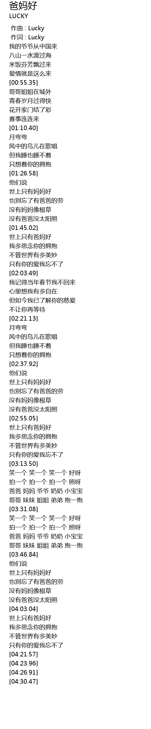 | [02:55.64] | shì shàng zhǐ yǒu bà mā hǎo |