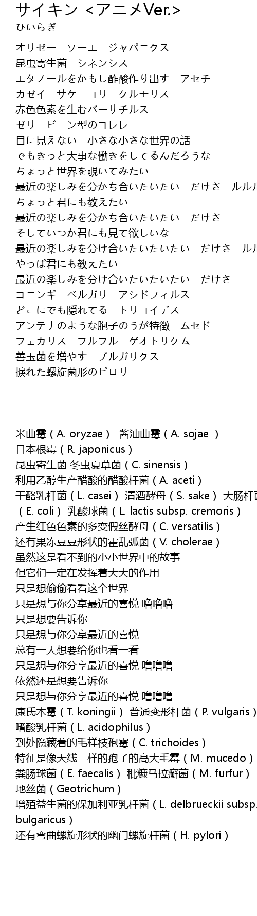 | [00:17.66] | 干酪乳杆菌(L. casei) 清酒酵母(S. sake) 大肠杆菌 (E. coli) 乳酸球菌(L. lactis subsp. cremoris) |