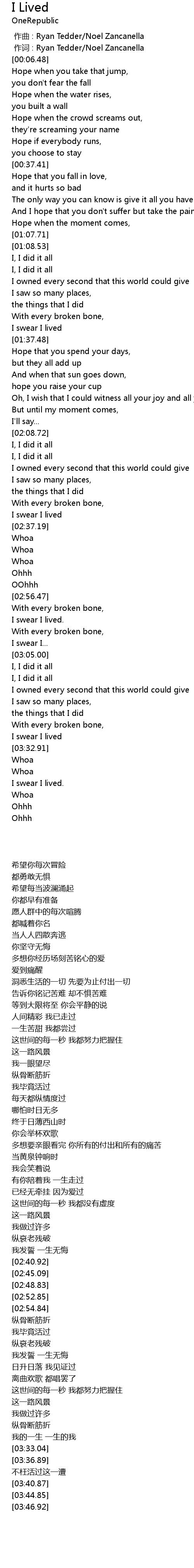 | [00:01.00] | 作词 : Ryan Tedder/Noel Zancanella |