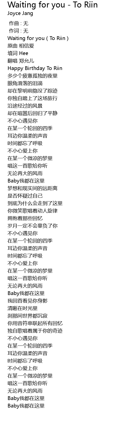 | [01:17.520] | Baby wǒ dōu zài zhè lǐ |
