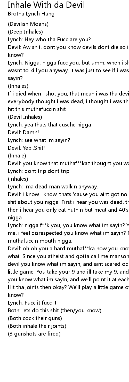 Devil: oh oh you a hard muthaf**ka now you know im sayin. well ill tell you what. Since you atheist and gotta call me manson 'cause you dont believe in tha devil you know what im sayin, and aint scared od dying and shit, lets play this little game. You take your 9 and ill take my 9, and we'll cock that shit back you know what im sayin, and we'll point it at each other you know what im sayin, Hit tha joints then okay? We'll play a little game of Russion Roulette then you know?