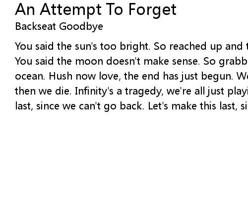 | You said the sun's too bright. So reached up and tore that bastard from the sky. You said the moon doesn't make sense. So grabbed it tight and drowned it in the ocean. Hush now love, the end has just begun. We're bored but alive. We live then we die. Infinity's a tragedy, we're all just playing along. Let's make this last, since we can't go back. Let's make this last, since we can't go back. |