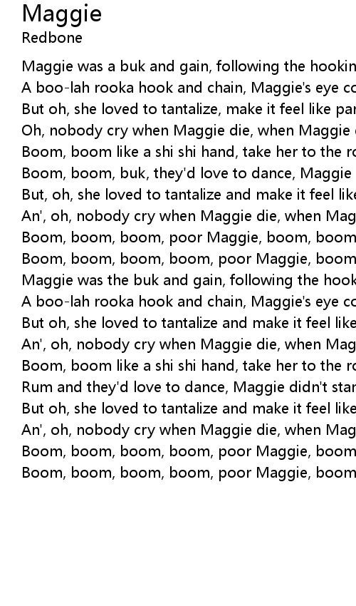 Boom, boom, boom, boom, poor Maggie, boom, boom, boom, poor Maggie |