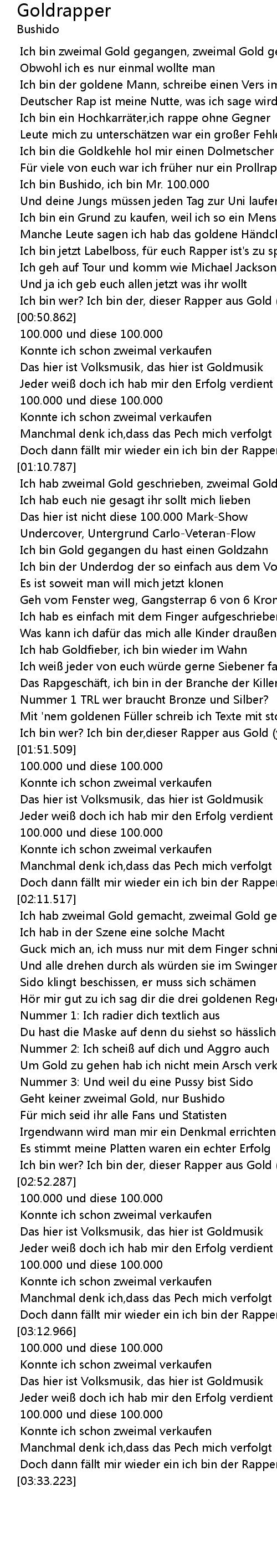| [03:30.152] | Doch dann f llt mir wieder ein ich bin der Rapper aus Gold yeah |