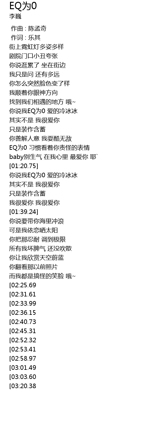 | [03:23.40][02:25.69] | 你说我EQ为0 爱的冷冰冰 |