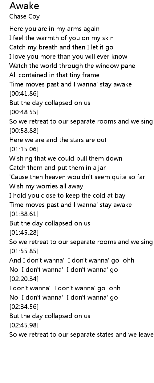 | [00:36.55] | Time moves past and I wanna' stay awake |