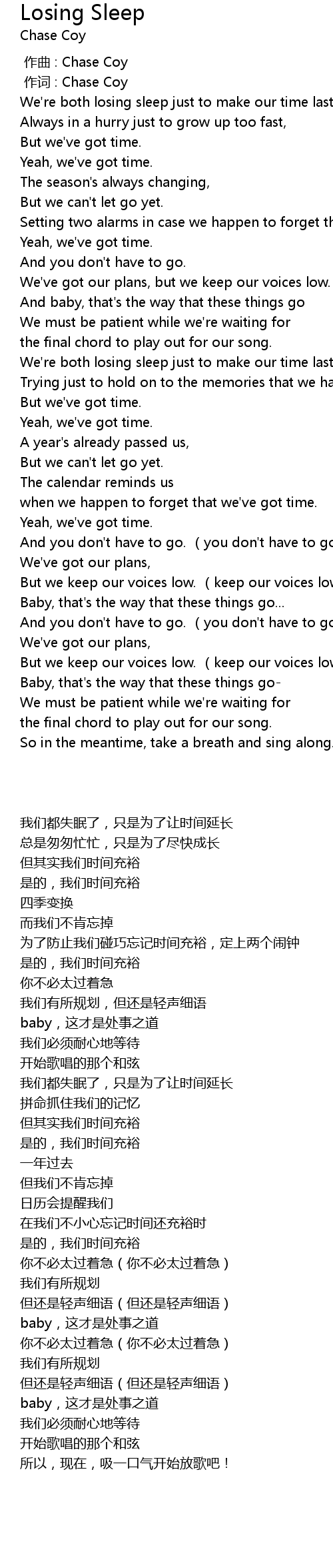 | [00:06.82] | We' re both losing sleep just to make our time last. |