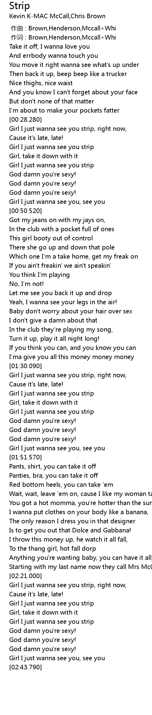 | [02:26.760] | Girl I just wanna see you strip |
