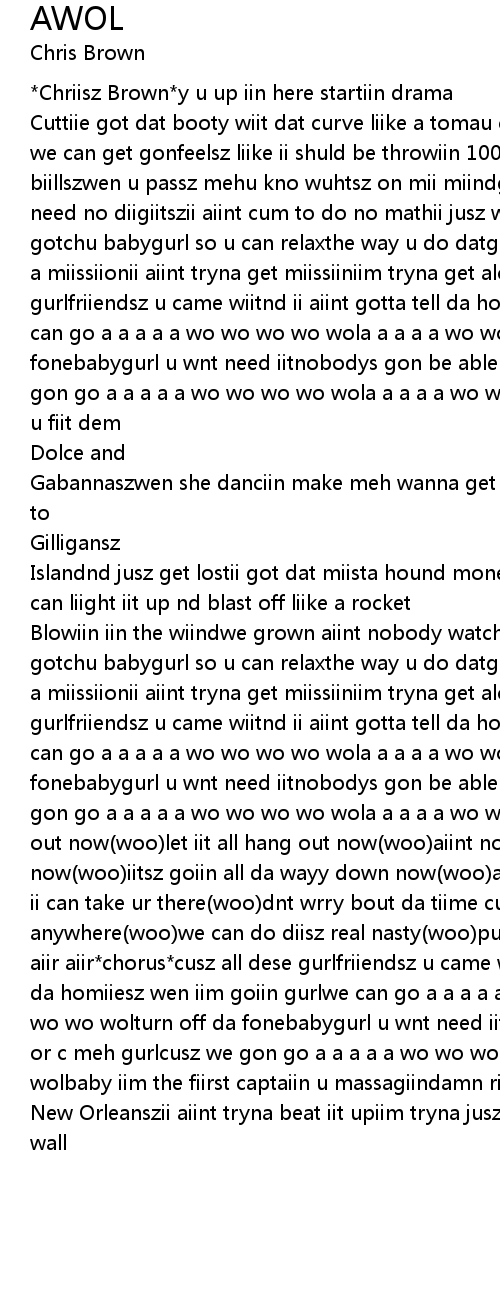 Cuttiie got dat booty wiit dat curve liike a tomau can diisappear iin mii hand tiill tomorra [x2]we can get gonfeelsz liike ii shuld be throwiin 100 dollar biillszwen u passz mehu kno wuhtsz on mii miindgurl u aiint gotta ask mehii dnt need no diigiitszii aiint cum to do no mathii jusz wanna get gon*chorusz*ii gotchu babygurl so u can relaxthe way u do datgurl da way u move datu kno iim on a miissiionii aiint tryna get miissiiniim tryna get alonecusz all dese gurlfriiendsz u came wiitnd ii aiint gotta tell da homiiesz wen iim goiin gurlwe can go a a a a a wo wo wo wo wola a a a a wo wo wo wo wolturn off da fonebabygurl u wnt need iitnobodys gon be able to reach iit or c meh gurlcusz we gon go a a a a a wo wo wo wo wola a a a a wo wo wo wo wolgot damn ii love da way u fiit dem