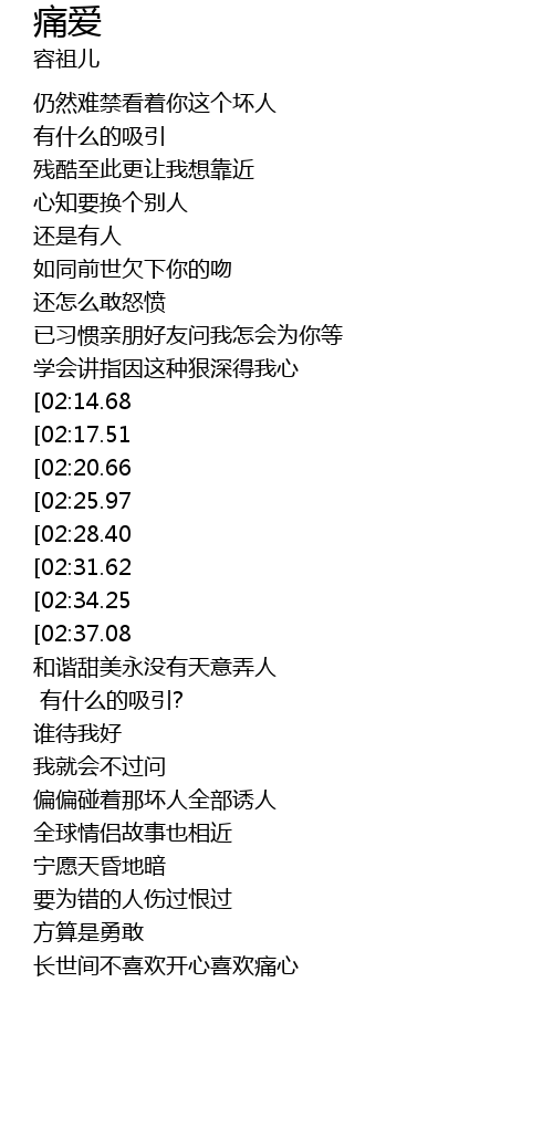 | [03:06.35][02:37.08][01:16.79] | 我就让你永远痛爱着我/我愿让你爱上我更加多 |
