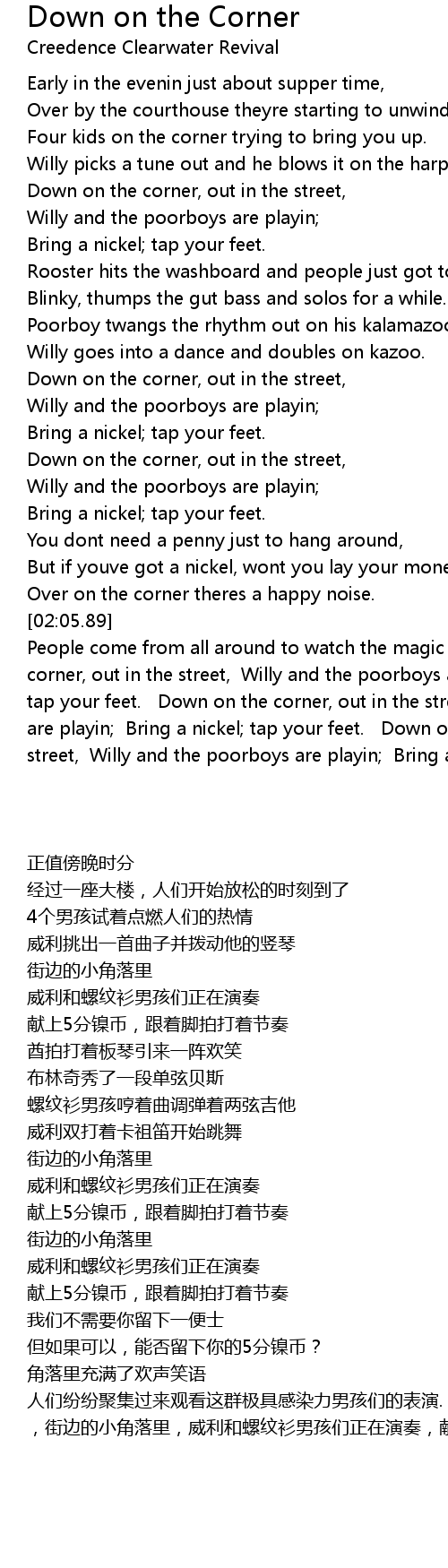 People come from all around to watch the magic boy. Down on the corner, out in the street, Willy and the poorboys are playin; Bring a nickel; tap your feet. Down on the corner, out in the street, Willy and the poorboys are playin; Bring a nickel; tap your feet. Down on the corner, out in the street, Willy and the poorboys are playin; Bring a nickel; tap your feet. |