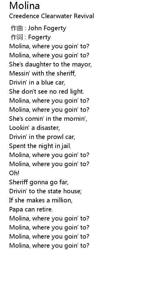 | [00:34.92] | Molina, where you goin' to? |