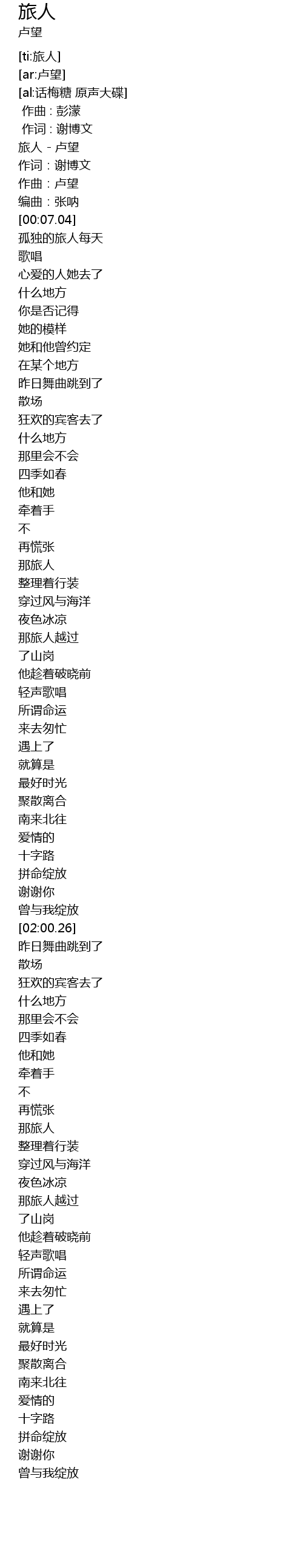 | [00:00.25] | 旅人 - 卢望 |