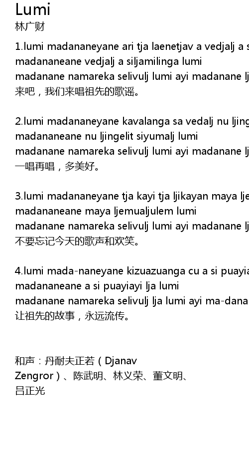 | 和声:丹耐夫正若(Djanav Zengror)、陈武明、林义荣、董文明、 | |