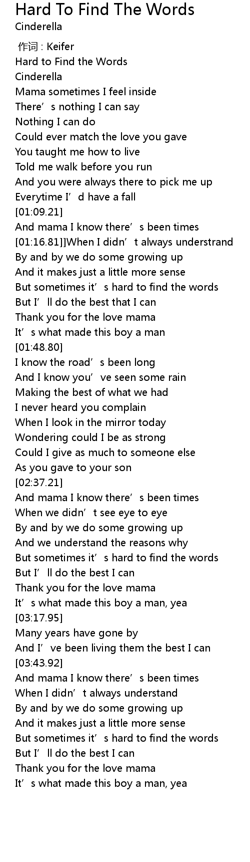 | [04:12.91] | But sometimes it' s hard to find the words |