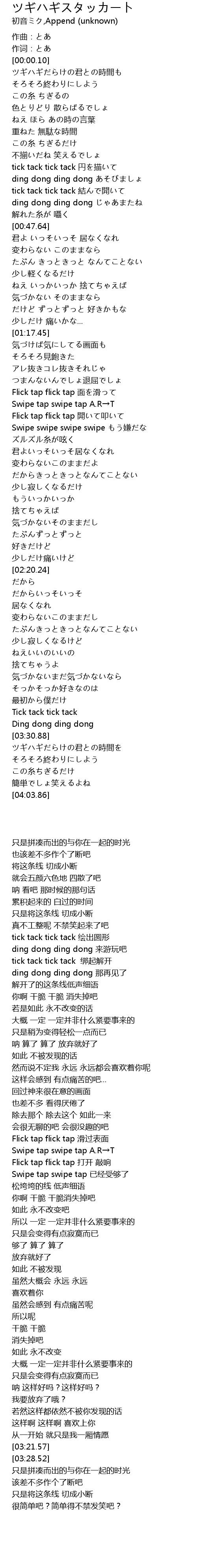 | [00:36.51] | tick tack tick tack 結んで開いて |